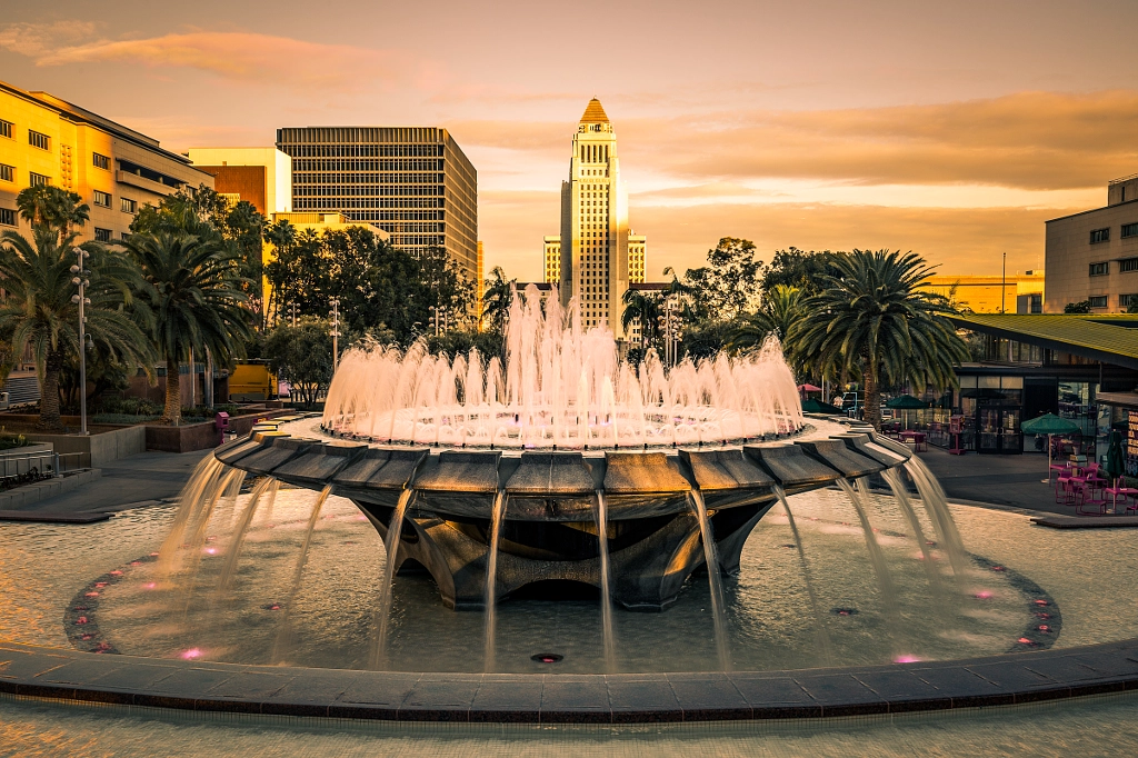 "As part of the Downtown LA landmark series, while spending a late afternoon and an evening, I turned to one of my favorite sights - the water fountain at Grand Park with a view of the City Hall. I waited till the sunset glow started hitting the iconic building. Usually the lighting at this pretty water fountain intermittently changes in a few different colors, like blue, red and yellow. But it didn't change from magenta (or pink) that evening. Then, later as I was packing up, it dawned on me that it stayed magenta because it was Valentine's Day." - H. Peter Ji